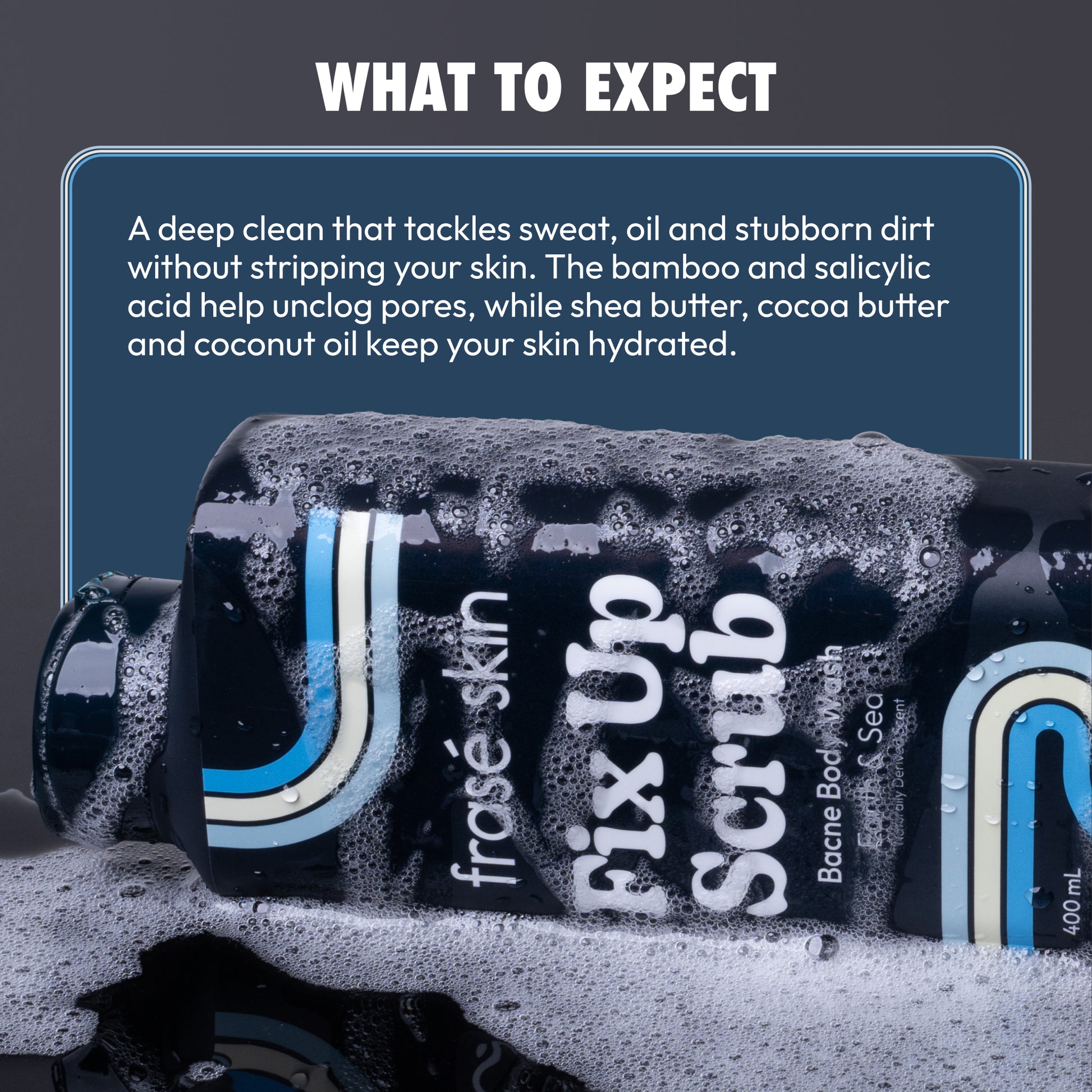 It scrubs off sweat, grease, dirt, and dead skin while helping to clear bacne and clogged pores. Think of it as a power wash for your body.