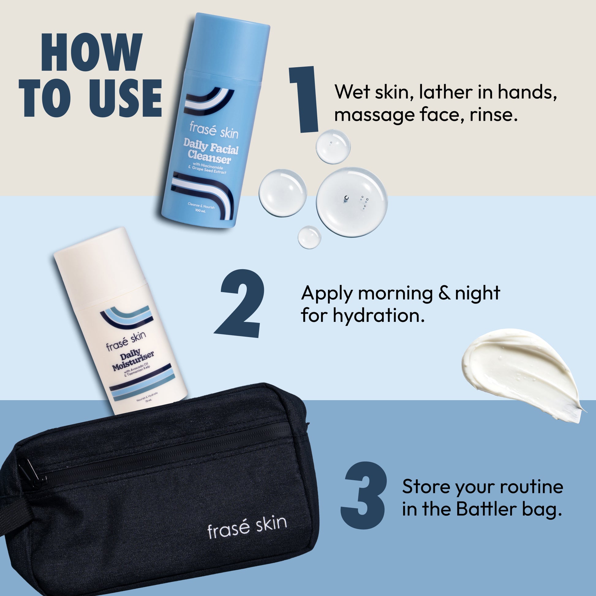 The Battler Kit comes with our Daily Facial Cleanser, Daily Moisturiser, and Battler Face Buffer, all packed in a handy toiletry bag.