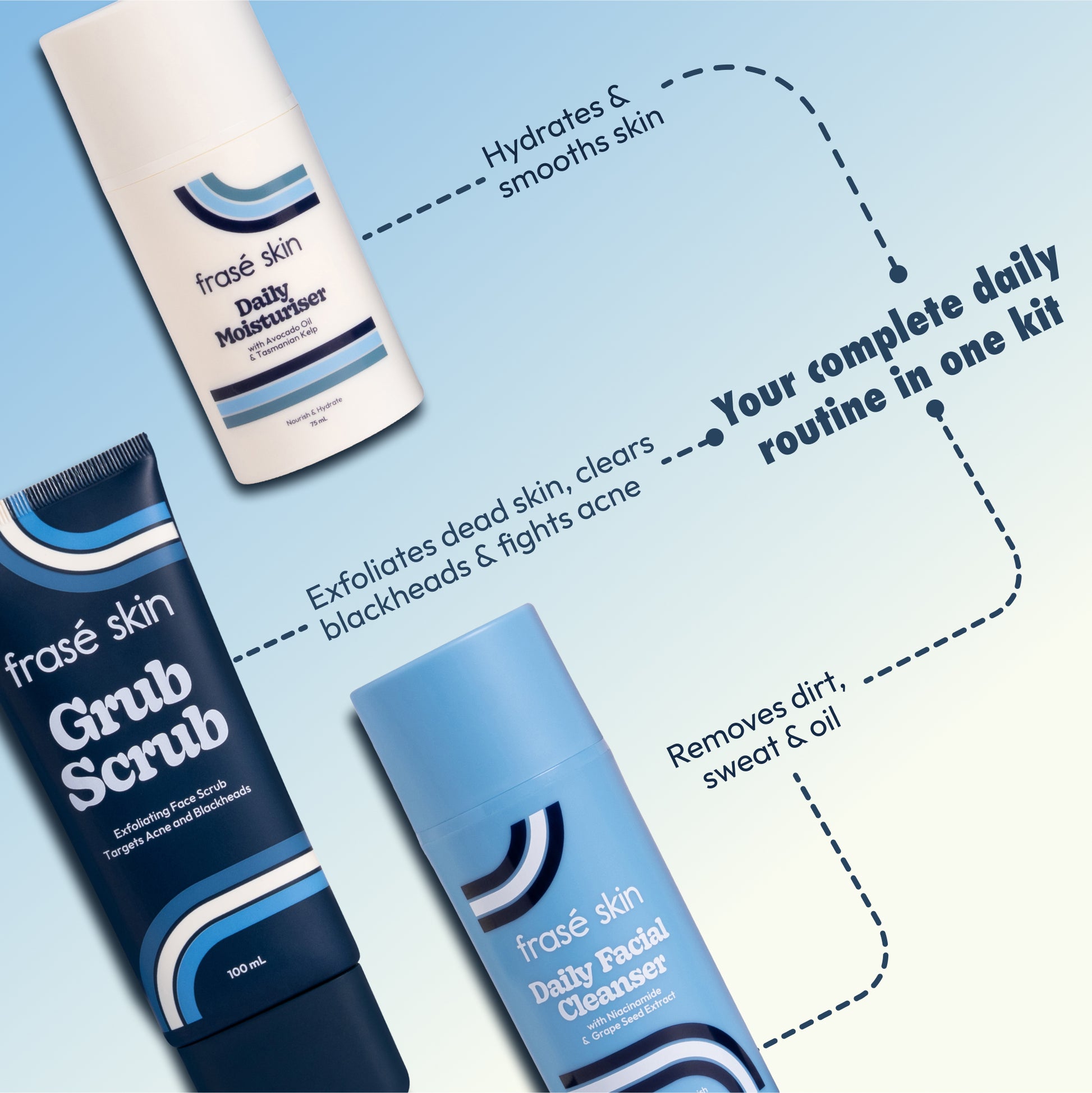 Used daily (cleanser and moisturiser) with the scrub 2–3 times a week, the kit will last about 6–8 weeks depending on use.