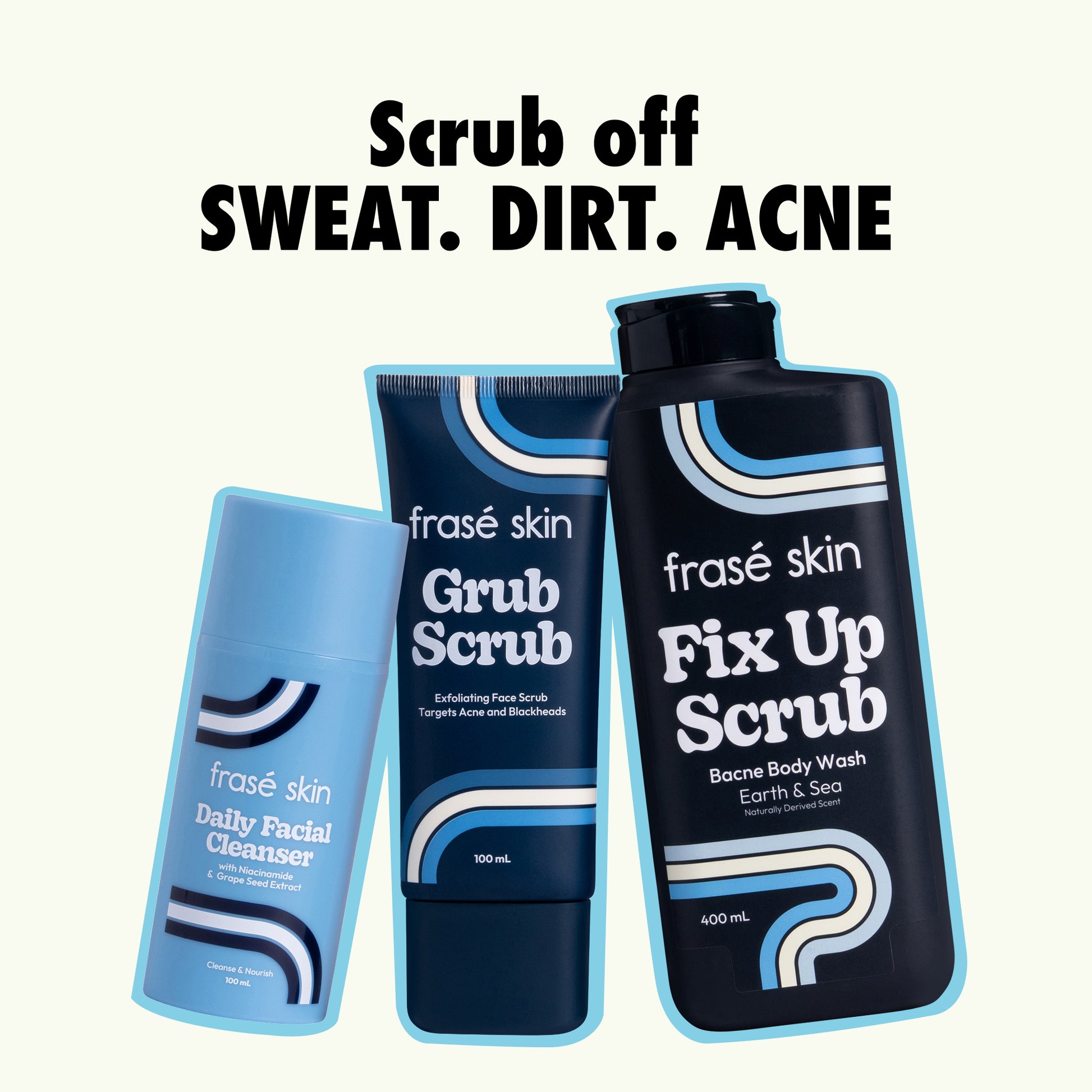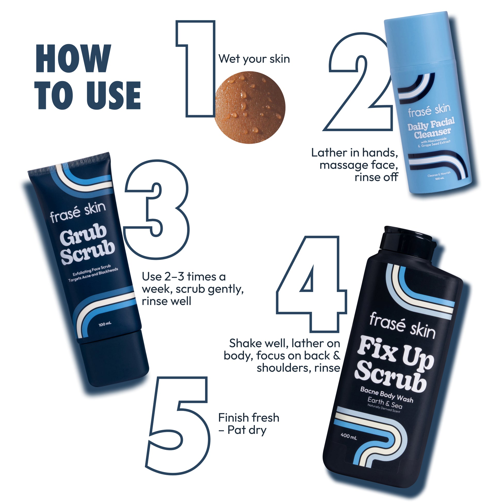 Cleanser first, then Grub Scrub, then Fix Up. But you can use the body wash first then proceed to the skincare but with cleanser as step 1 always.